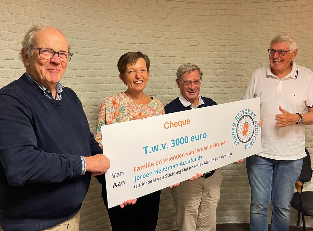 Wij zijn dankbaar voor het Jeroen Heitzman Accufonds. Met de aanschaf van nieuwe accu’s kunnen onze elektrische fietsen tot hun maximale levensduur worden gebruikt. Hierdoor hebben mensen die niet meer zelfstandig kunnen fietsen zo lang mogelijk plezier van deze voorziening. Het fonds kan hier een goede bijdrage aan leveren. Het is dan ook een eer dat de familie Heitzman heeft besloten het fonds op te richten en onder te brengen bij Fietsmaatjes Alphen aan den Rijn.